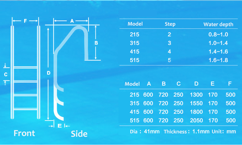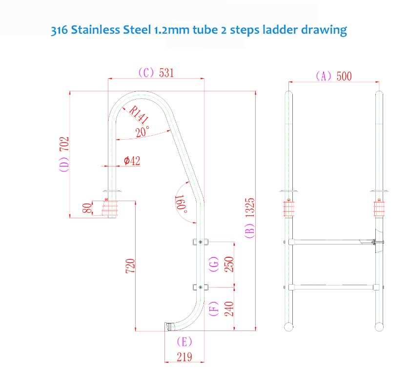 1.0/1.2mm thickness tube Swimming Pool Floor Ladder Step Replacement 316 Stainless Steel Ladders With 2 Steps For Swimming Pool