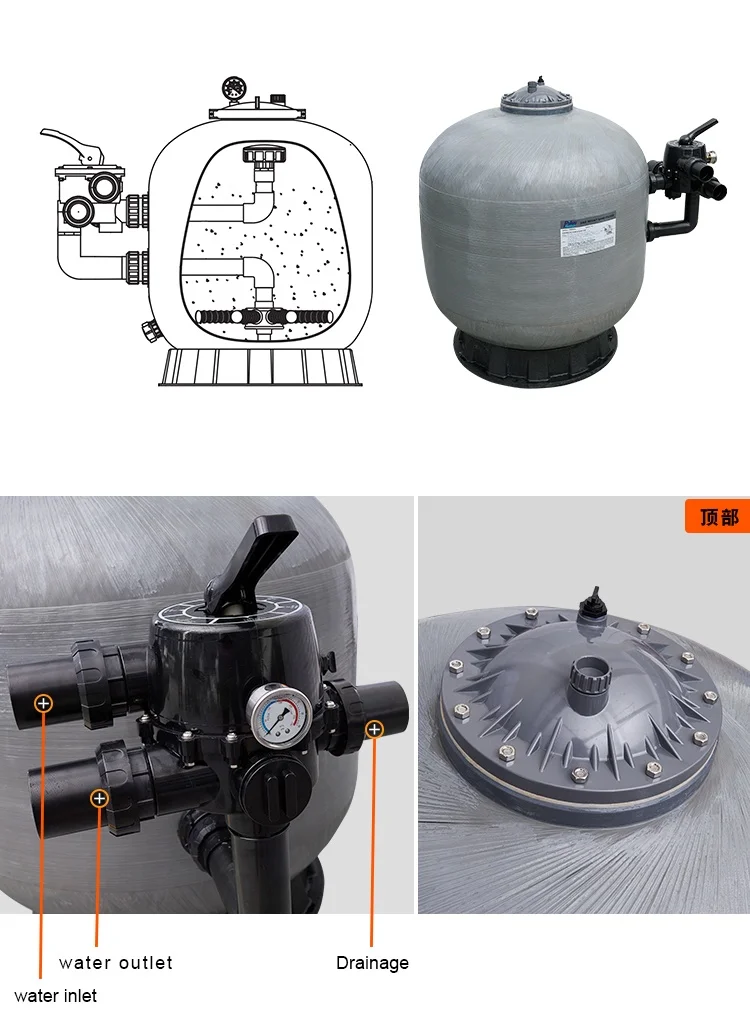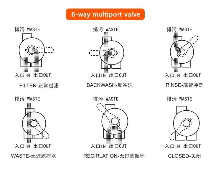 1) Suggested Installation: Domestic In-ground and above ground pool / hot spa tub. 2) Max operating pressure 36 psi / 2.5 bar. 3) Max temperature of 43°C (109°F). 4) Universal standard of union connection provided. 5) Suggested size of media: 0.5-0.8mm. |