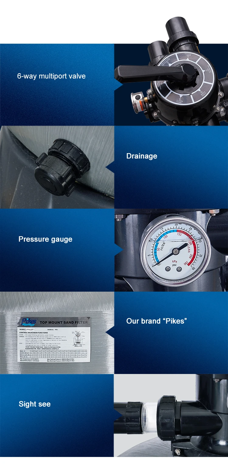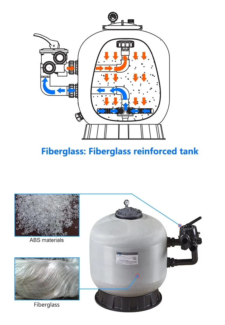 Bobbin- wound fiberglass reinforced tank is still the most popular standard in the industry. With UV- resistant surface finish, it is able to operate under prolong sunlight for years of reliability. “PS” series ( PS525- PS1400) filters are equipped with a six- way multiport valve, clamp style multiport valve and ABS laterals.