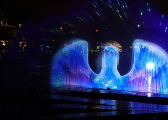 Special video projection on the “screen” by special video projector then ,forming of water curtain film. When the audience in the film, the fan-shaped water curtain and the natural night sky as an intergrated one . when the characters out of the screen, like the characters fly to the sky or from heaven, making in a kind of illusory and fantastic feeling, fascinating.