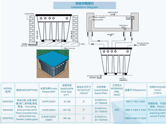 DSW500 Embedded Intergrative Filteration System is made of high quality fiberglass and resin, the fiberglass winding structure makes the sand filter more stronger, there is UV – resistant on the surface, the whole filter has good resistance to chemical and sun protection. The A series bobbin – wound fiberglass top mount filter is the first choice for water treatment equipment at swimming pools, hot springs, spas, aquariums and water parks etc.