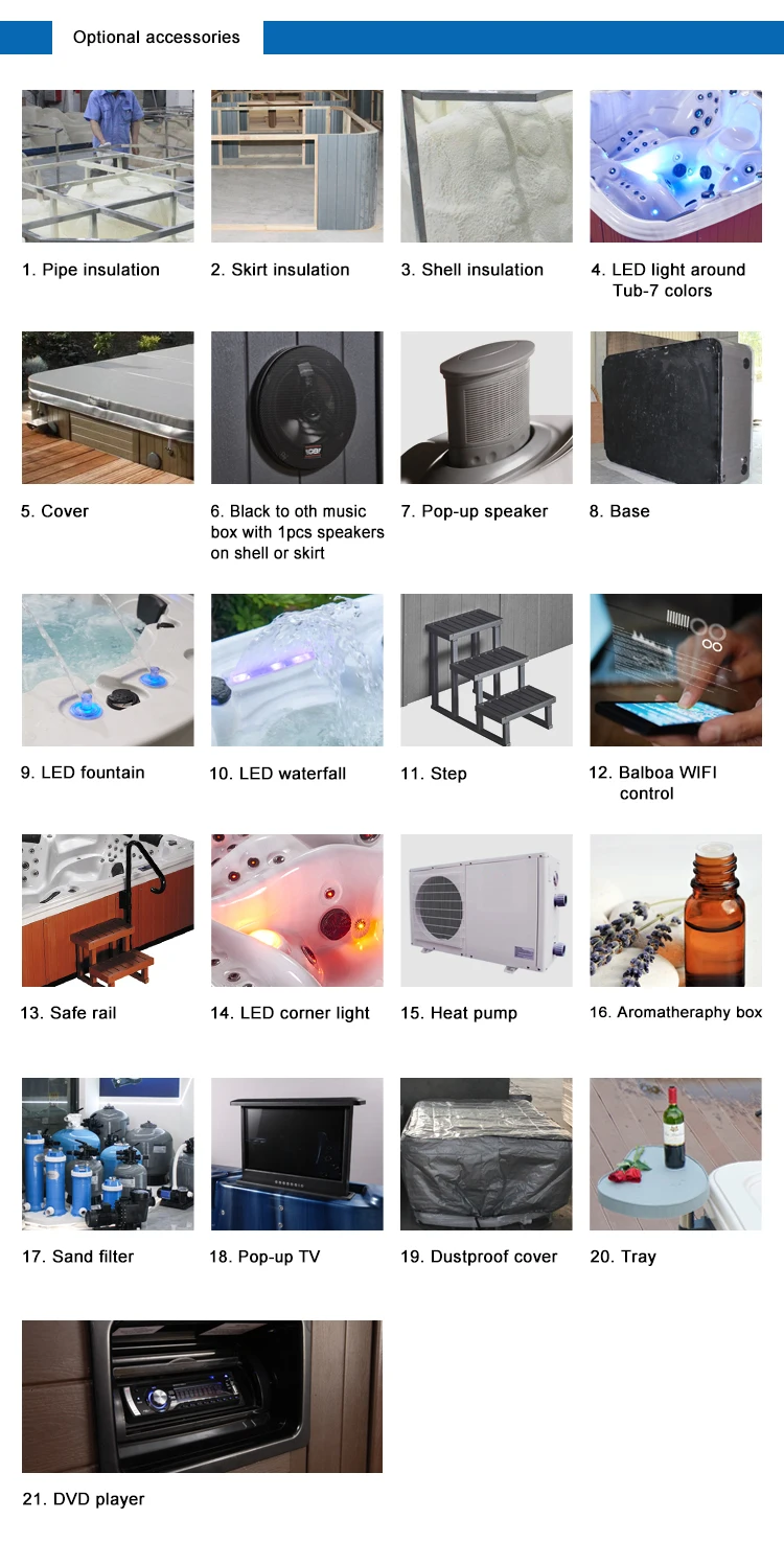 1.Are you a manufacturer or a trade company? We are a professional spa manufacturer with more than 10 years. 2.Do you have other options to choose? Yes.We have many other options for you, such as TV,etc.