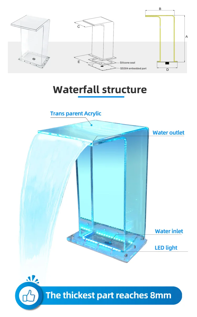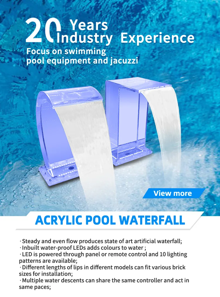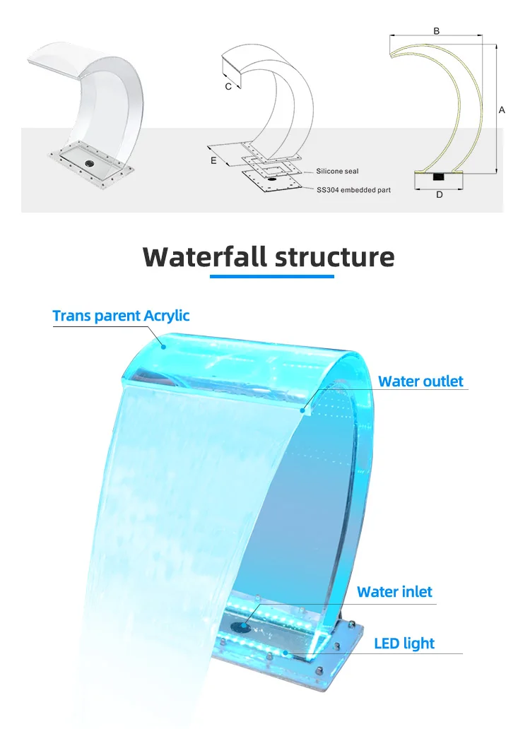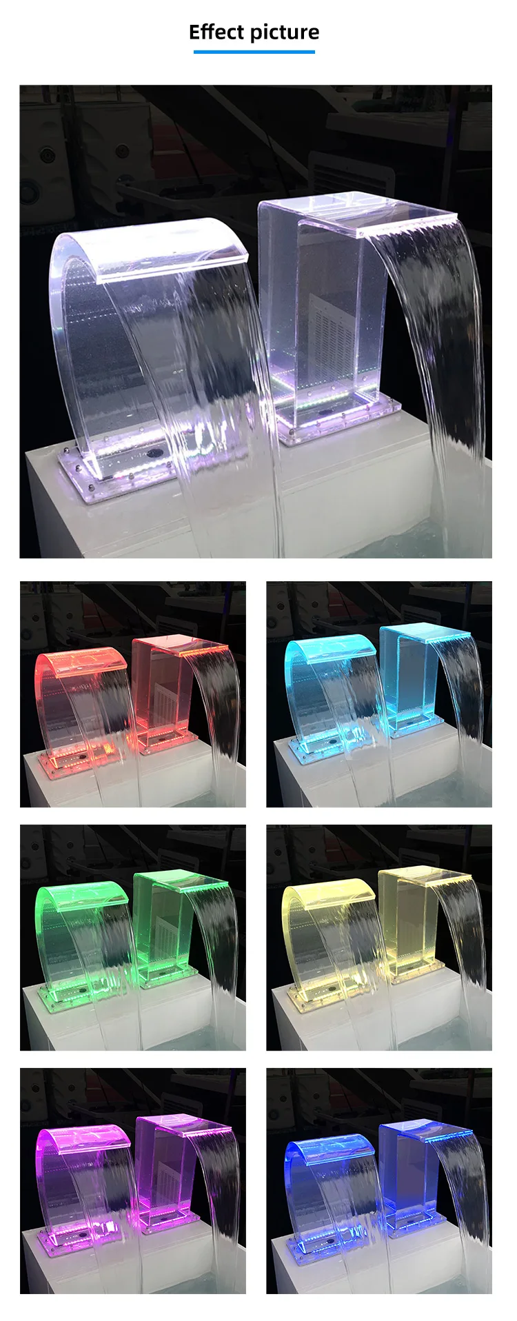 Acrylic cascade waterfall swimming pool fountain with led lights provides more than a decorative element in home and garden or swimming pool. Fountains are works of art and aid oxygenation of the water which is essential for all aquatic plants and animals. Water feature also adds a sound feature to the place in which they are installed which is very relaxing and pleasant.