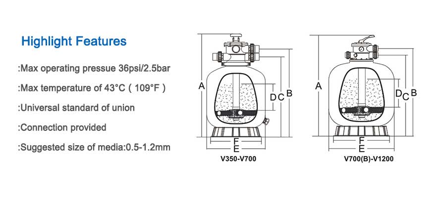 | Mode | Filter Area (㎡) | Vatve Connections | Max Flow Rate | Gravel (kg) | A mm | B mm | |