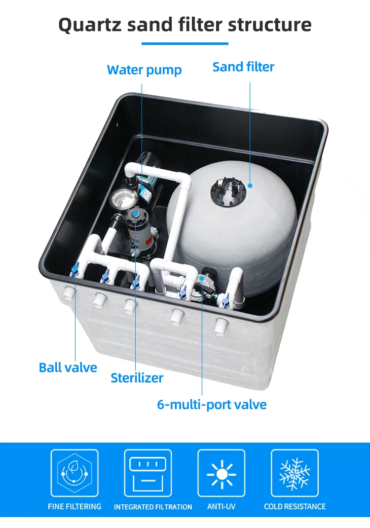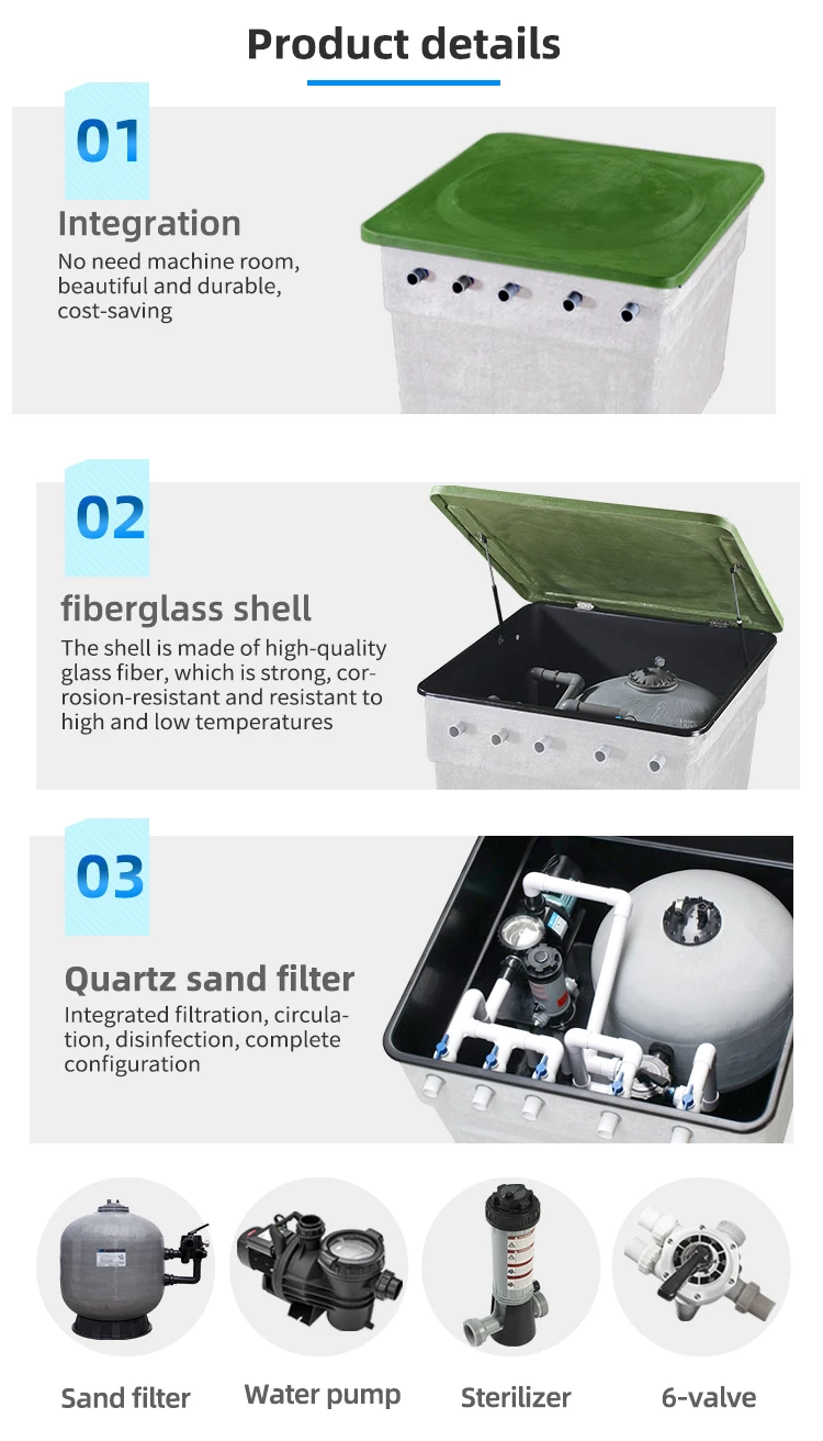 In-ground filter are made of fiberglass and polyvinylchloride which reasonable design and good-looking and durable.The in-ground does not need a machine house, which save construction cost, convenient operation and save maintenance cost. Mulyic use inground sand filter assemble complete set filtration configuration to high filtering capacity and to reach to back wash. According with swimming pool specifications and standards.