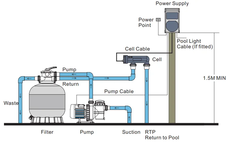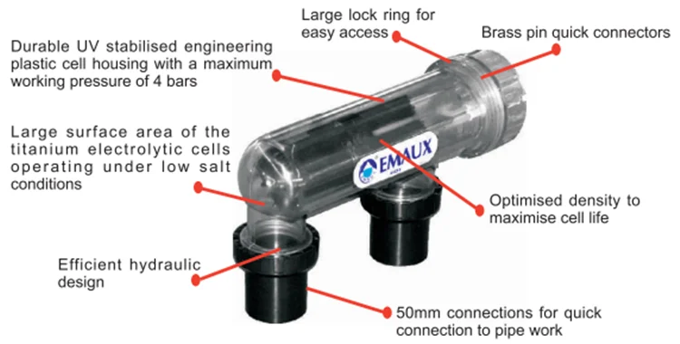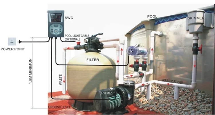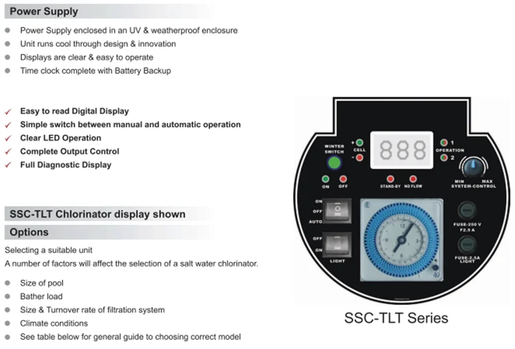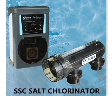Salt Chlorinator (SSC series), are an alternative means of sanitizing your pool with chlorine using the process of electrolysis. The electrolysis process is achieved by passing the salt water solution through an electrolytic cell which converts sodium chloride (salt) in the water into chlorine gas which, when dissolved in the water become sodium hypochlorite (liquid chlorine).