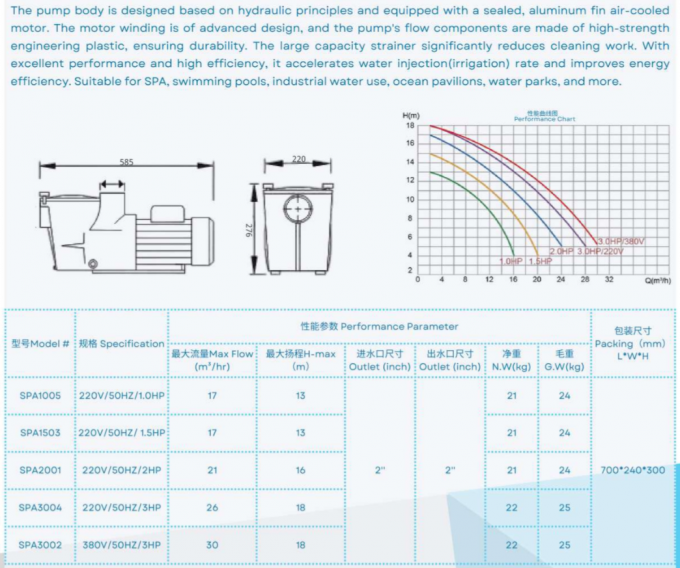 The SPA1005 Swimming Pool Water Pump For Swimming Pool Water Fountain is widely using in Jetted bath tubs, spa pools, swimming pools, fountain ponds, massage stations and other water cleaning systems.