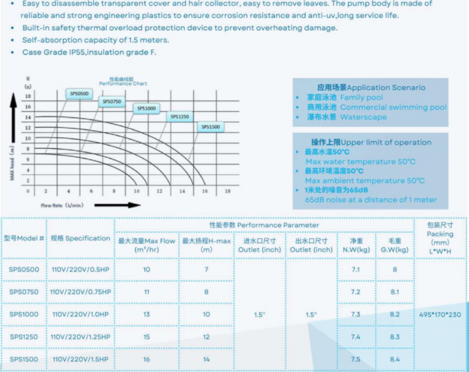 The SPS 0500 Swimming Pool Water Pump For Swimming Pool Water Fountain is widely using in Jetted bath tubs, spa pools, swimming pools, fountain ponds, massage stations and other water cleaning systems.
