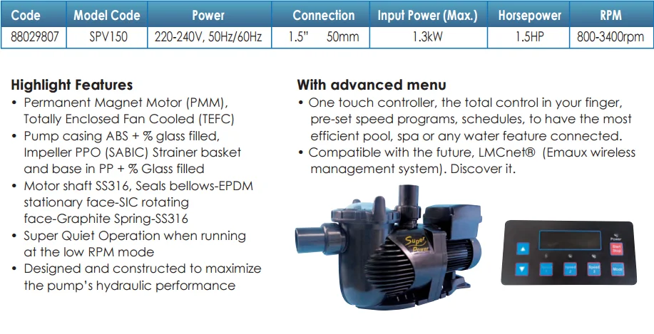 Emaux SuperPower series variable speed pump is designed and manufactured to benefit the pool industry with a valuable product that pool owners will appreciate on their power bill. The energy saving pump would widely apply on pool, spa, waterfall, and water features. It provides the best energy saving solution from over-usage and to increase efficiency and reduce maintenance cost.
