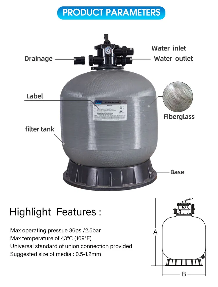 Aided by innovative techniques and modern machinery, we are able to manufacture and supply Top Mount Swimming Pool Sand Filter. These products are used in swimming pools for emitting sand from water. Owing to their longer service life, low maintenance, high performance, resistance against corrosion, smooth operation and effective functionality, these products have gained a high demand in the market. Top Mount Swimming Pool Sand Filter is delivered to the clients in a timely manner owing ot our wide distribution network.
