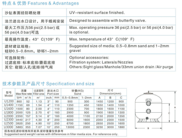 U1200 Manufacturer Supply Commercial Swimming Pool Fiberglass Sand Filter With Flange is durable, corrosion – resistant, glossy finished in gel coats for a smooth and beautiful exterior, which is popular in the market. This collection of sand filters is the perfect choice for high – end villas and hotel pools, high – class spas and wellness pools, baths, fish ponds etc.